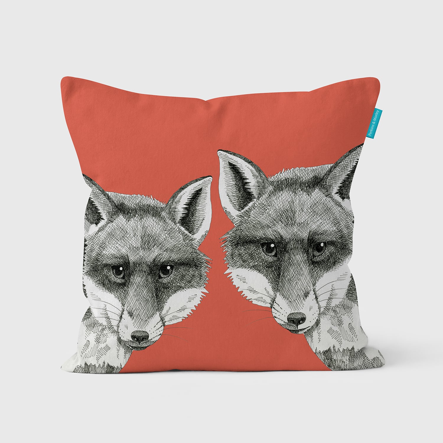 Two cheeky Foxes peer round the edge of the cushion on a gorgeous soft orange.