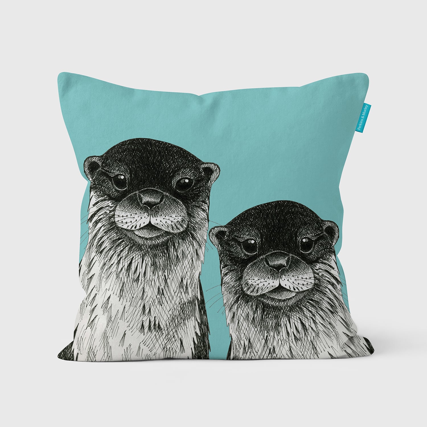 Two cheeky Otters peer round the edge of the cushion on a gorgeous soft blue.